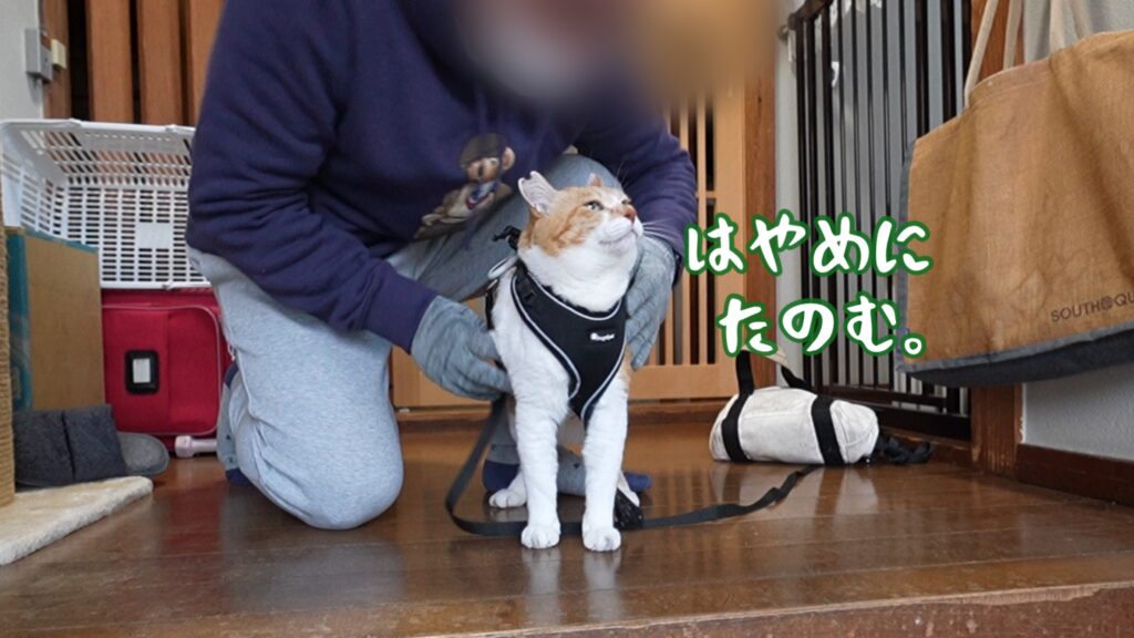 でも、そんな感動的なシーンの裏で、やっぱりお約束の展開が。 2ヶ月ぶりの「とーさんぽ」に出かけようとしたとーさんですが、なんとチャチャの「鎧(ハーネス)」の付け方がわからず大パニック!
