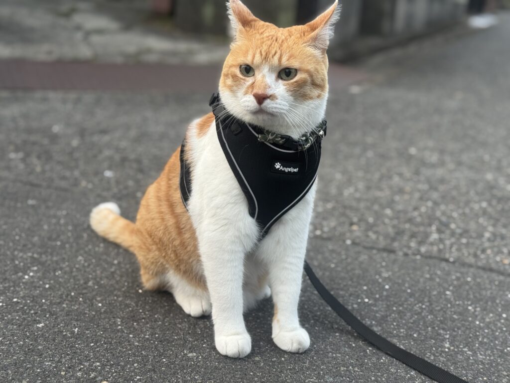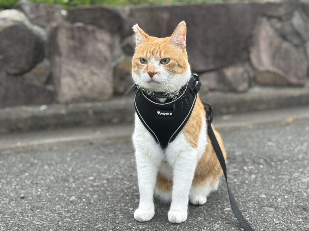 [amazonjs asin=”B07WQJCXRC” locale=”JP” title=”猫 猫用 ハーネス 胴輪 猫具 ねこ ネコ 子猫 子犬 小型犬 散歩 お出かけ 抜けない ベスト ソフト胸あて 軽量 頭を通さずマジックテープで装着 サイズ調節可 夜反射 通気メッシュ (S, ブラック)”]